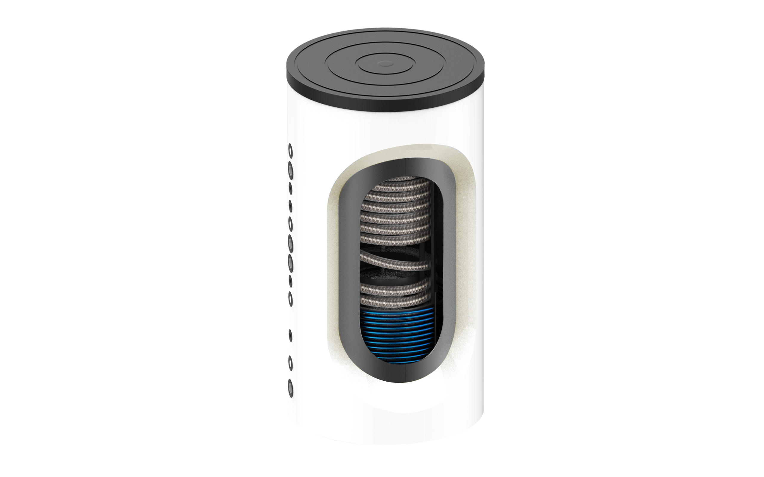Serbatoi in acciaio al carbonio S235JR: superiore grezzo ed inferiore con trattamento di vetrificazione, protetto da uno strato di smalto porcellanato a lunga durata, con 1 scambiatore e flangia di ispezione.